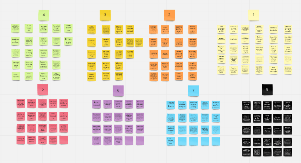 Affinity Diagram: Writing down key points from a data collection session and grouping them together (e.g. with post-it notes)